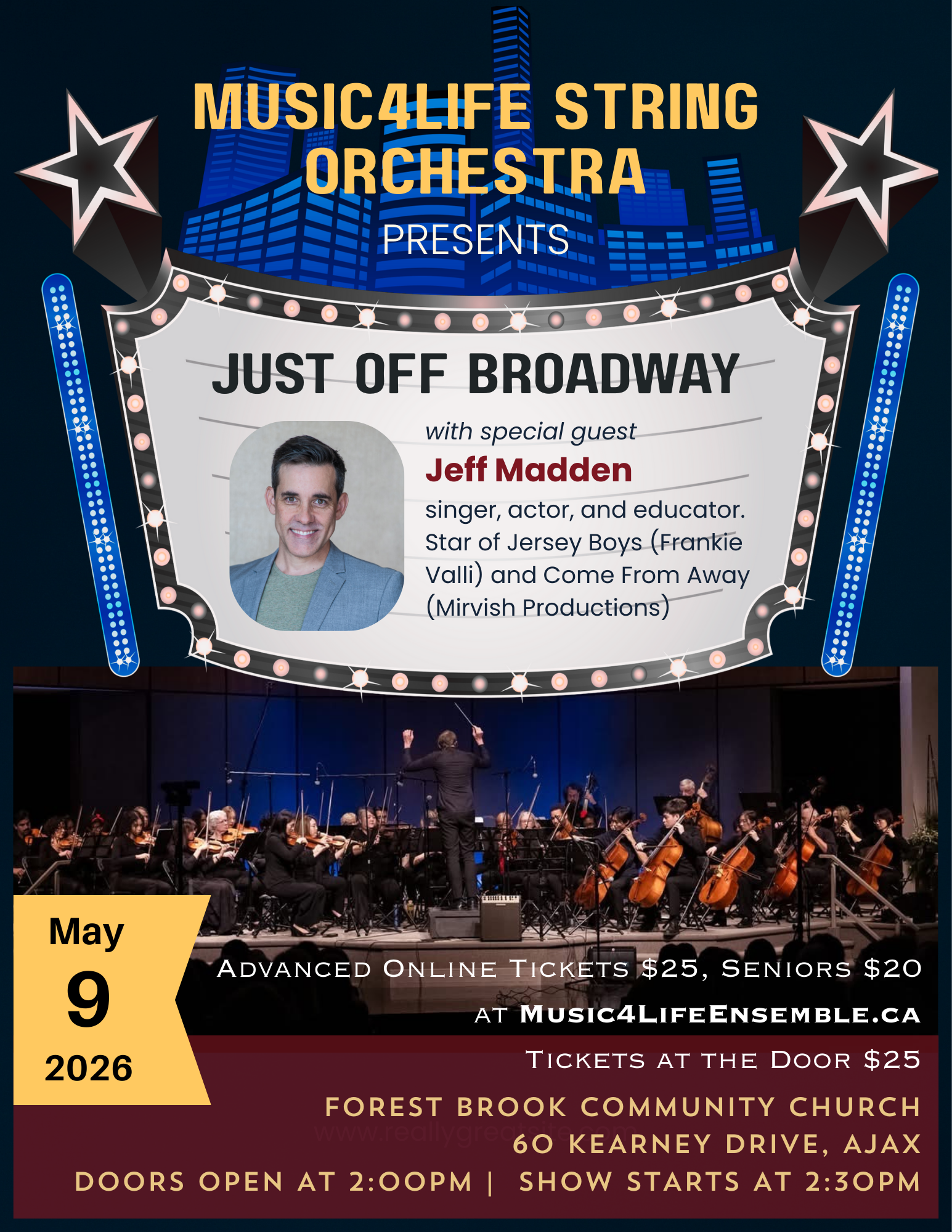 Get ready for an afternoon of beloved Broadway music and iconic stage-inspired favourites....bold, familiar, and full of theatrical flair. On Saturday, May 9, 2026, Music4Life String Orchestra brings the excitement of the Broadway stage to life through soaring strings and unforgettable melodies audiences know and love.